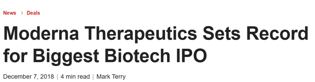 2018年12月,Moderna成功登陆纳斯达克市场,IPO以每股23美元的价格发行,筹集资金超过6亿美元,创下了Biotech领域IPO募资的历史纪录。
