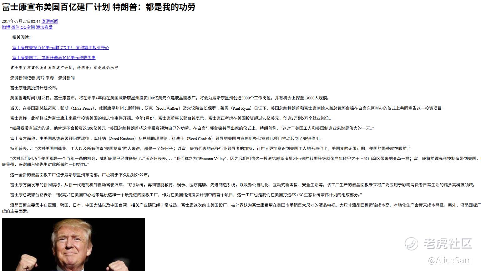Mount Pleasant的这片土地承载着美国制造业的集体记忆。2017年,富士康在此宣誓建设100亿美元的面板工厂,承诺创造13,000个岗位,时任总统特朗普亲自奠基。然而这一愿景迅速破灭。至2023年,富士康全州雇员仅1,000人,村政府背负超2.5亿美元的土地征收债务。我翻出来了2017年的旧闻,哈哈,当初也是川哥执政哦。[鬼脸]