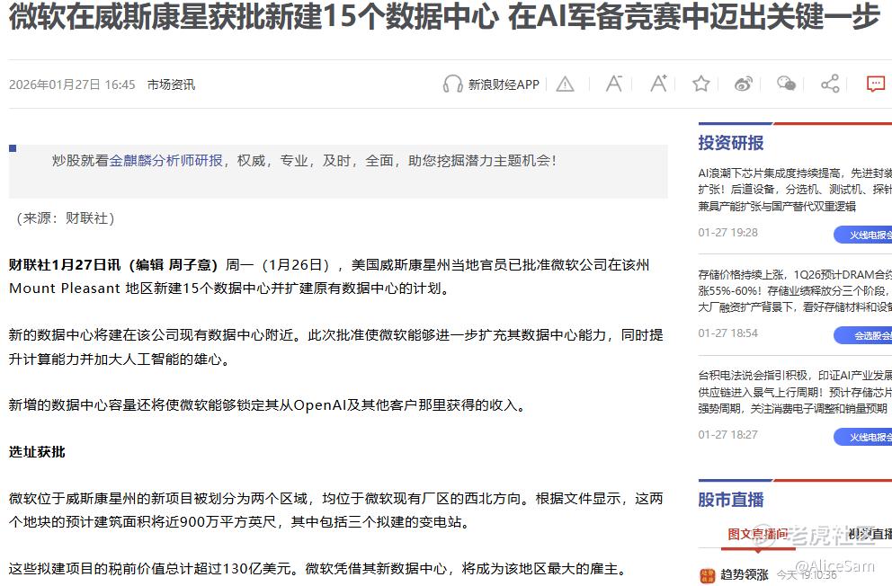 2026年1月26日,美国威斯康星州Mount Pleasant村委员会的一纸 unanimous approval(全票通过)决议,为科技史上最大规模的基础设施"救赎"项目画上了关键句号。微软获准在该村建设15座全新数据中心,总建筑面积近900万平方英尺(约83.6万平方米),应税价值逾130亿美元。几乎在同一时间,NVIDIA宣布向AI云服务商CoreWeave追加20亿美元投资,双方誓言在2030年前建成超过5GW的"AI工厂"。