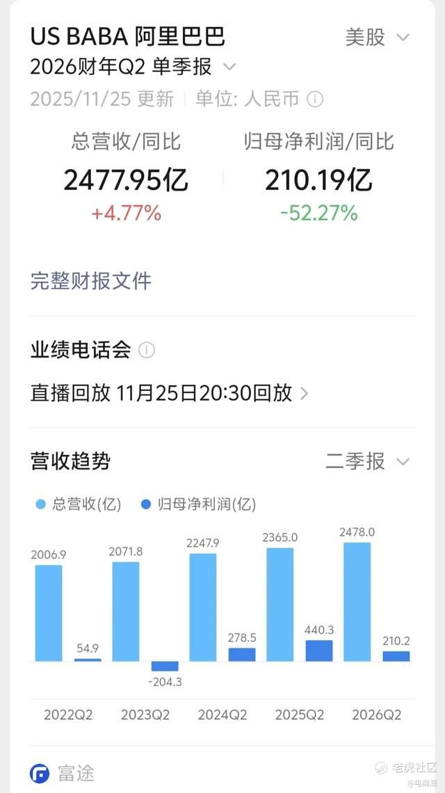 而阿里巴巴2026财年第二财季总营收2477.95亿元,同比增长4.77%;非公认会计准则(non-GAAP)净利润210.19亿元,同比下滑52.27%。