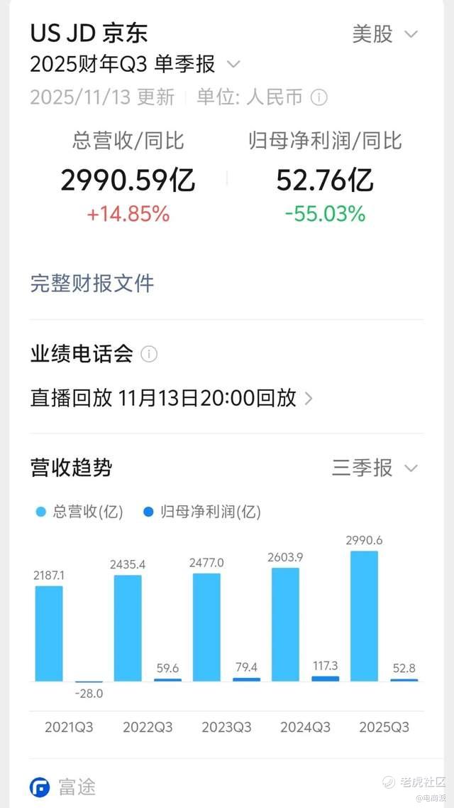 财报数据显示,京东集团2025年第三季度收入达到2991亿元人民币,同比增长14.9%;净利润52.76亿,同比下滑55.03%。