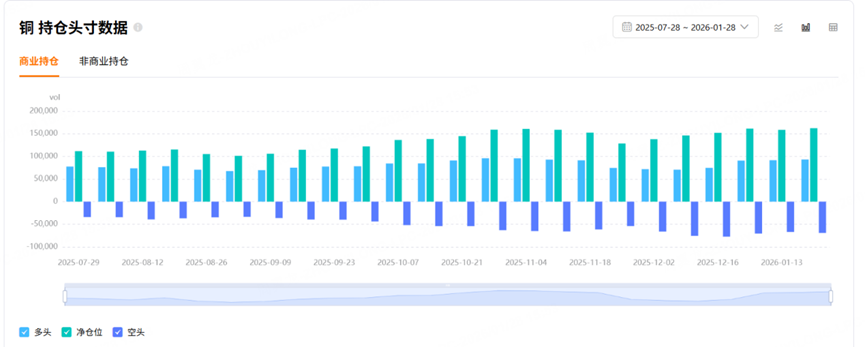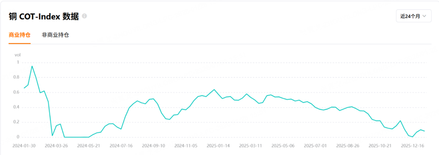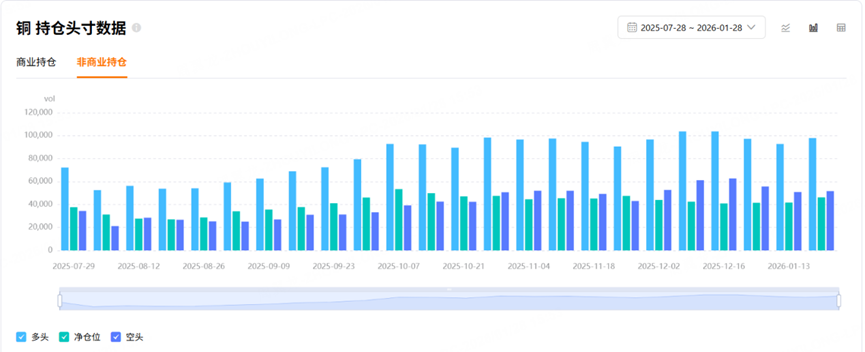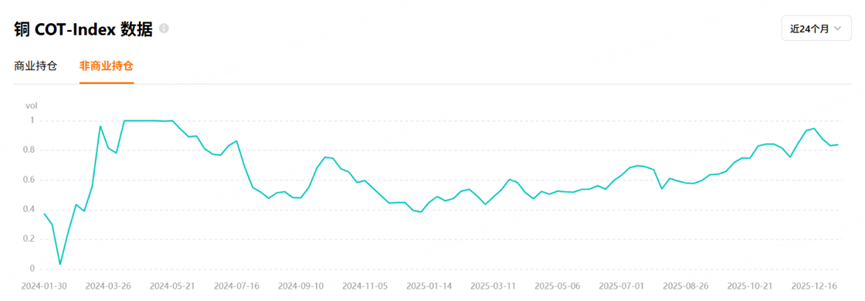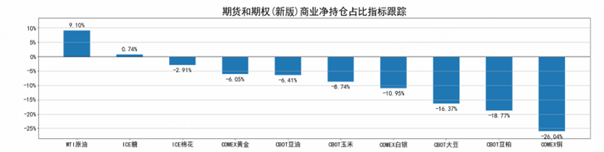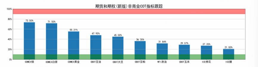 非商业净持仓占比,即对冲基金、投资机构等持有的净多头头寸占比,这部分往往是发动行情的主要力量,他们通常是顺着趋势买,因此可以跟随基金的力量来进行投资。从非商业净持仓占比指标来看:COMEX铜和COMEX黄金 $黄金主连 2602(GCmain)$ $微黄金主连 2602(MGCmain)$ 的非商业净持仓占比为负且绝对值较大,说明受到基金的关注度较高。