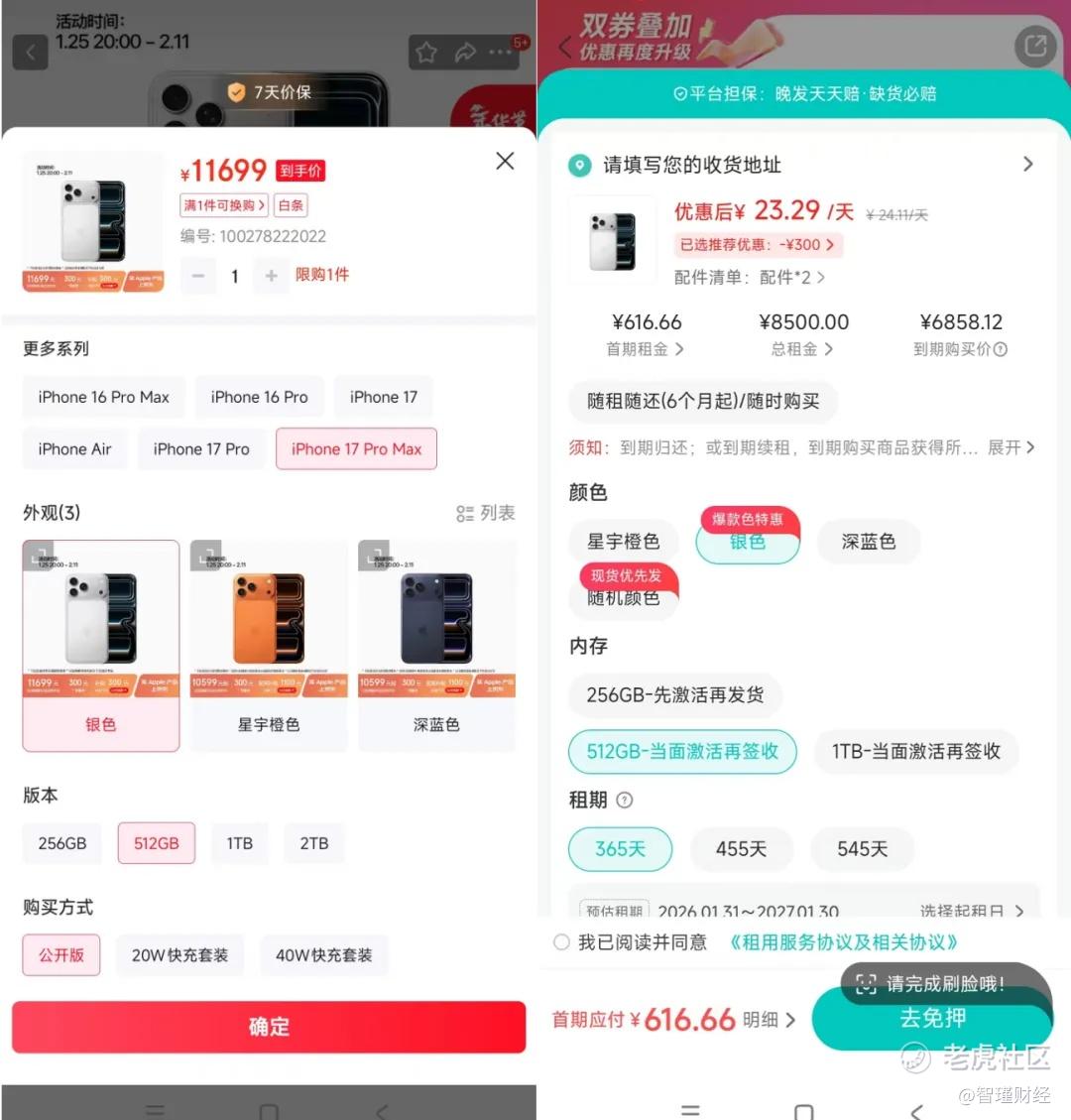 作为对比,开甲财经在人人租尝试免押租用银色iPhone 17 Pro Max 512G(当面激活再签收),租期365天(分12期),每期租金616.66元,到期购买价6858.12元。据此计算,人人租的综合租用成本达86.65%。