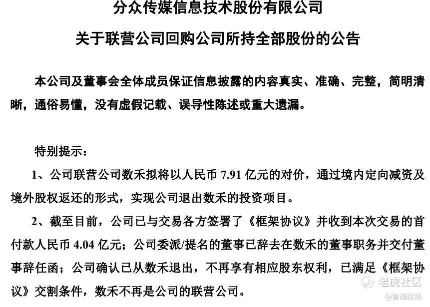 截至目前,分众传媒已与交易各方签署了《框架协议》并收到首付款4.04亿元;公司委派的董事已辞任,数禾科技不再是分众传媒的联营公司。
