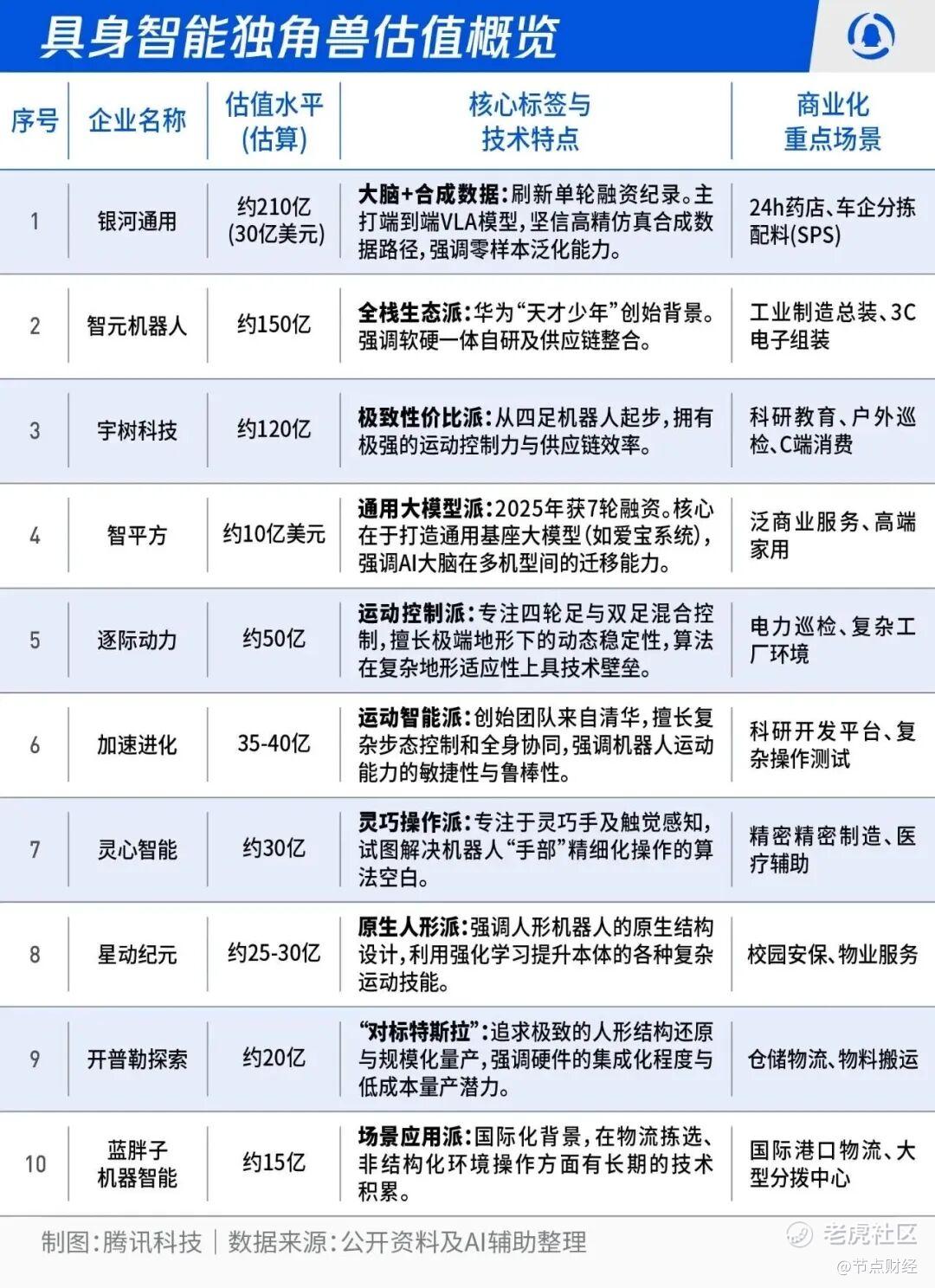 整个行业也出现了一批百亿估值的企业。目前来看,银河通用以200亿元的估值领先,随后是智元的150亿元估值,宇树科技则为120亿元估值。