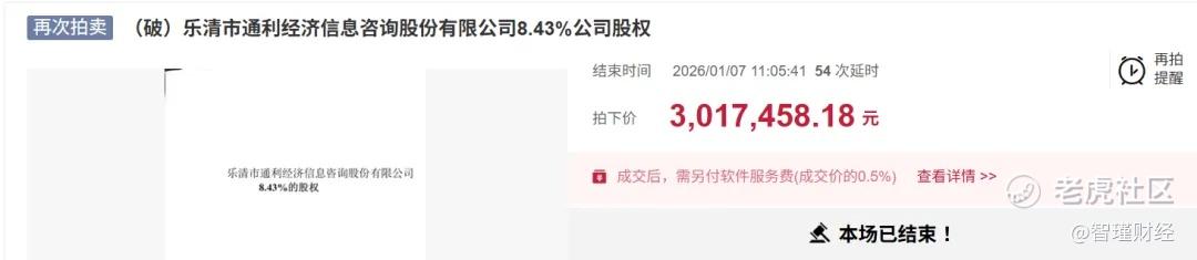 近日,淘宝拍卖信息显示,乐清市通利经济信息咨询股份有限公司(以下简称“通利咨询”)8.43%公司股权以301.75万的价格成交。