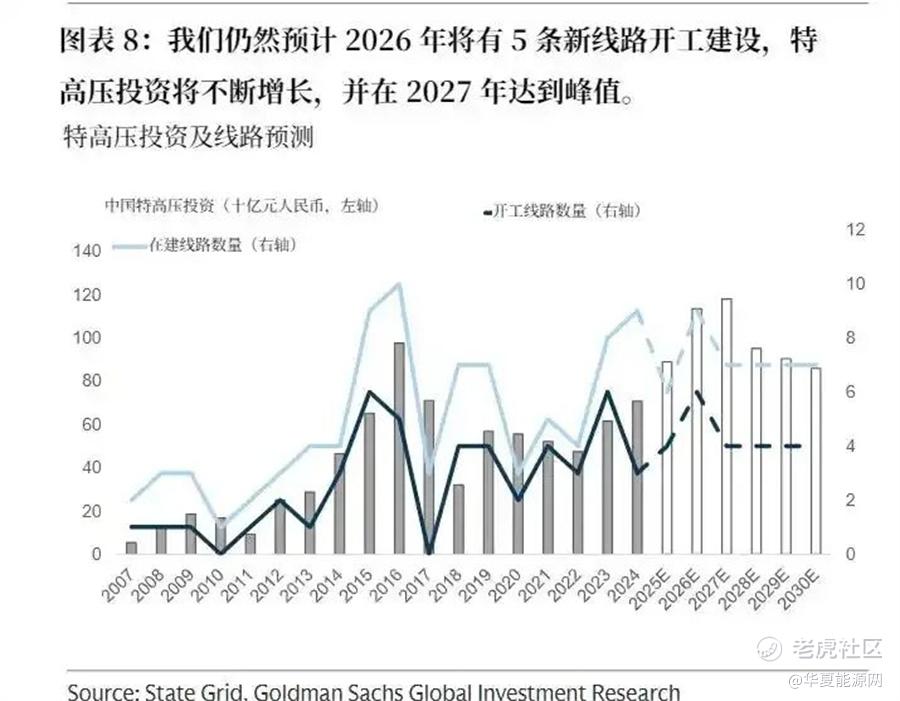 针对国家电网的四万亿投资计划,高盛发布研报预测,2026年将有5条特高压线路开建(图源:高盛)