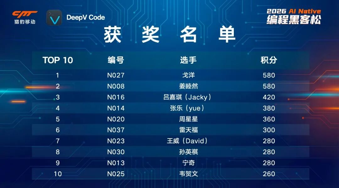 这群AI Coding“驾驶技术”超群的参赛者们,究竟会谁会在有限5个小时间内脱颖而出?先来看获奖完整名单。