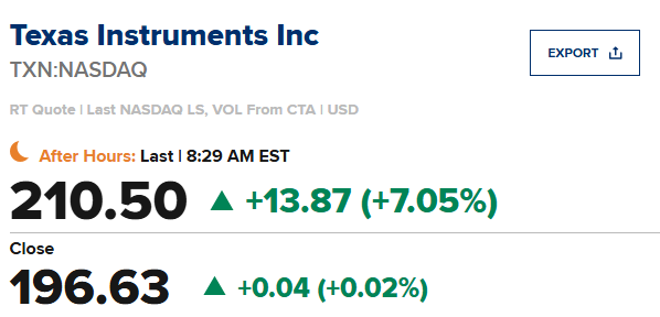 Texas Instruments (TXN)第四季度每股收益为1.27美元,比市场预期值1.28美元低0.01美元。该公司预计第一季度每股收益为 1.22 - 1.48 美元,市场预期值 1.26 美元;预计第一季度营收为 43.2 - 46.8 亿美元,市场预期值 44.2 亿美元。