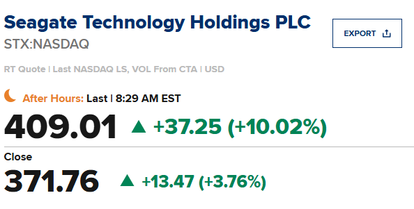 Seagate Tech(STX)第二季度每股收益为3.11美元,比市场预期值2.83美元高出0.28美元;营收同比增长 21.5%至 28.3 亿美元,市场预期值 27.4 亿美元。该公司预计第三季度每股收益为3.40美元,+/- 0.20美元,相当于3.20- 3.60美元,市场预期值2.99美元;预计第三季度营收为 29 亿美元,+/- 1 亿美元,约合 28 亿美元至 30 亿美元之间,市场预期值 27.8 亿美元。