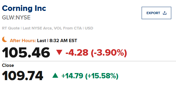 Corning(GLW)第四季度每股盈利0.72美元,比市场预期值0.71美元高出0.01美元;营收同比增长 13.9%至 44.1 亿美元,市场预期值 43.6 亿美元。该公司预计第一季度每股收益为 0.66 - 0.70 美元,市场预期值0.67 美元;预计第一季度营收同比增长约 15%至约 42 - 43 亿美元,市场预期值 42.6 亿美元。