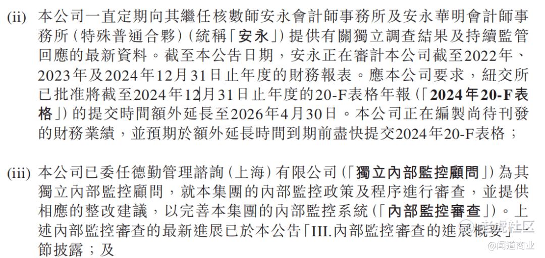 至于大家最关心的复牌进展,公告里也给了明确的交代:继任核数师安永正在审计2022-2024年财报,还已委任德勤为独立内部监控顾问,审查公司内控政策和程序,并提供相应的整改建议。虽然目前依然停牌,但至少每一步都有清晰的方向,不是毫无头绪地等待。复牌确实需要时间,毕竟要把过往的财务问题理顺、把内控漏洞补全,这种事情着急不来,慢慢打磨和修整,在我看来可能反而更让人觉得踏实。