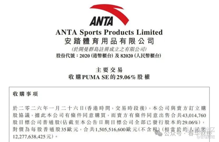 1月27日,一则公告震动了全球体育用品行业。安踏体育宣布,将以总计约15.06亿欧元(折合人民币超122亿元)的现金对价,收购德国运动品牌彪马(PUMA SE)29.06%的股权。交易完成后,安踏将成为彪马单一最大股东,并向其监事会委派代表。
