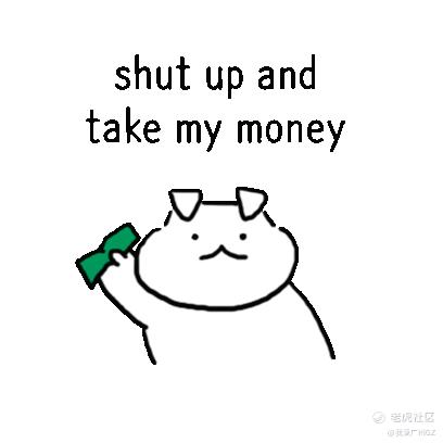 a cartoon cat is holding a green dollar bill and saying shut up and take my money