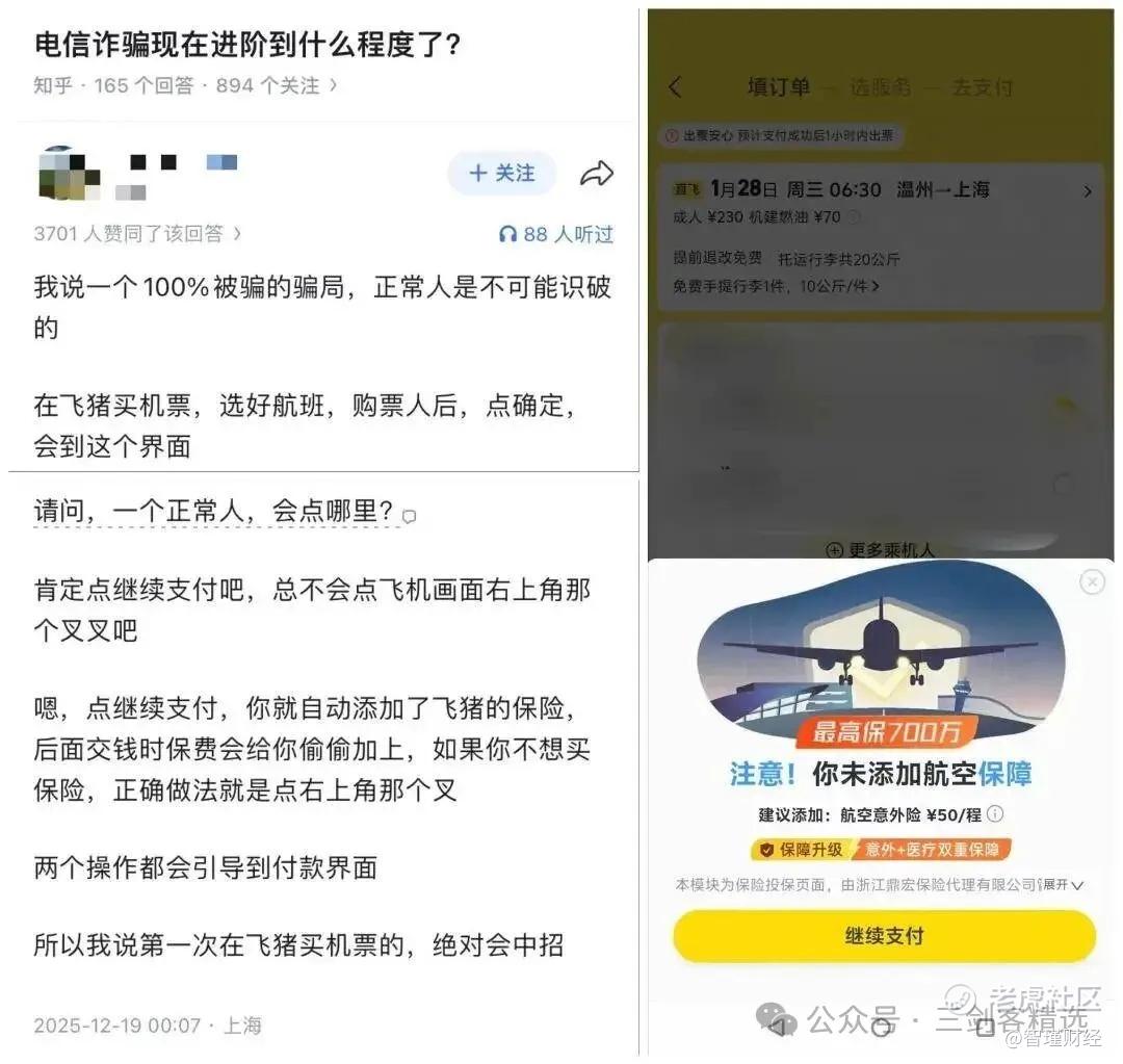 天眼查App显示,2025年12月19日,一位网友在社交平台愤怒爆料,自己在飞猪APP购买机票时,遭遇了隐秘搭售保险的骗局。选好航班、填好购票人信息并点击“确定”后,进入一个看似正常的支付界面。界面上,“继续支付”按钮极为醒目,而右上角那个毫不起眼、通常代表“关闭”或“取消”的叉号,极易被忽略。急于完成购票的用户,本能地点击“继续支付”,却不知不觉自动添加了飞猪的保险,保费在后续交钱时被偷偷加上。若不想买保险,正确操作竟是点击那个容易被忽视的右上角叉号,而且无论点击哪个操作最终都会引导到付款界面,这对于第一次在飞猪买机票的用户来说,中招几乎不可避免。