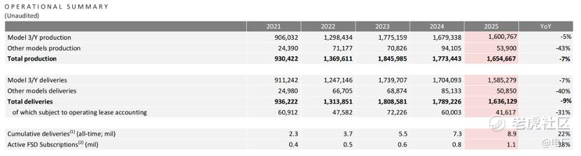 2025年,特斯拉全年汽车交付量约163.6万辆,同比下降8.6%;第四季度交付量约41.8万辆,同比下滑16%。汽车业务全年收入约695亿美元,同比下降约10%,在总营收中的占比继续下降。
