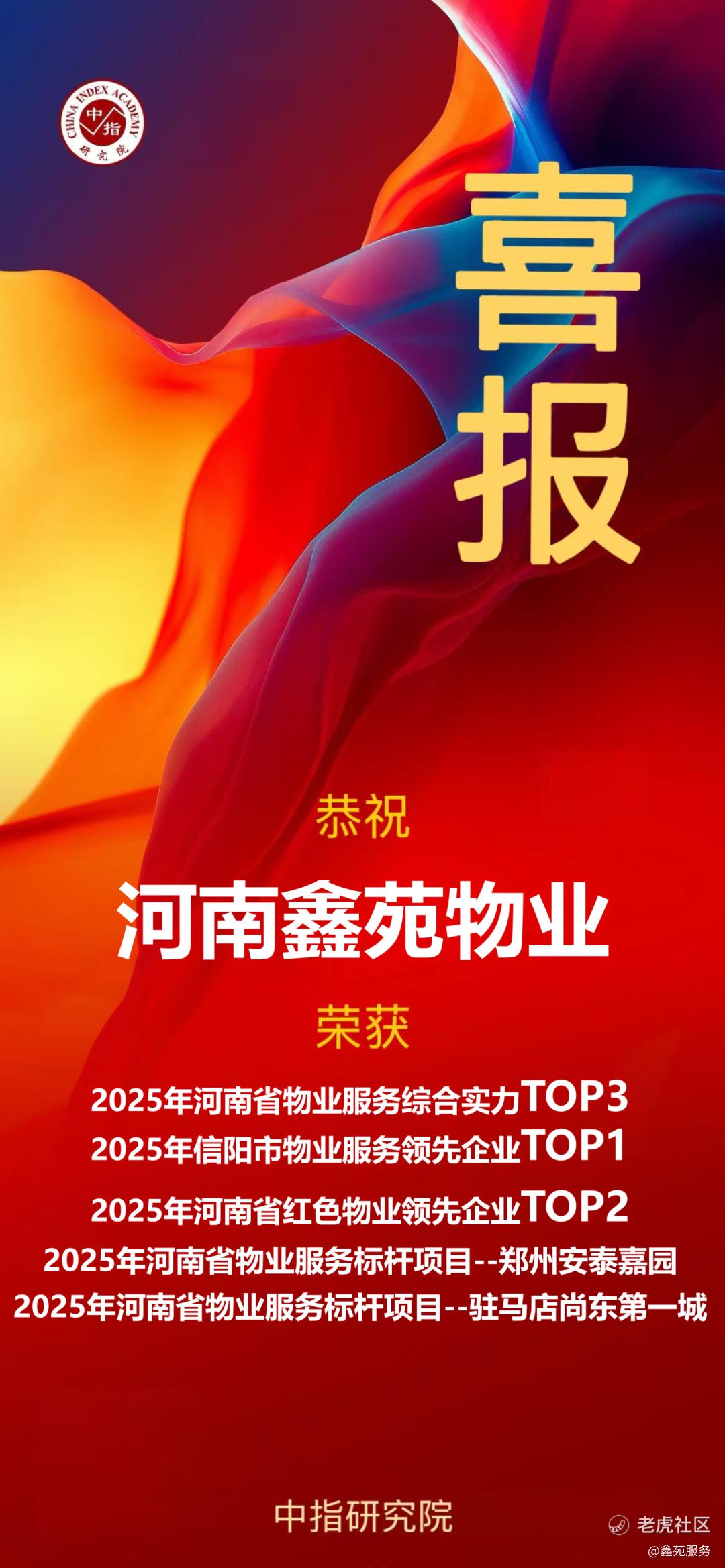 鑫苑服务凭借卓越的科技融合与实践能力,荣膺“2025年河南省物业科技赋能领先企业TOP1”。河南鑫苑物业揽获多项荣誉:“2025年河南省物业服务综合实力TOP3”“2025年信阳市物业服务领先企业TOP1”“2025年河南省红色物业领先企业TOP2”,其管理的“郑州安泰嘉园”与“驻马店尚东第一城”双双获评“2025年河南省物业服务标杆项目”。