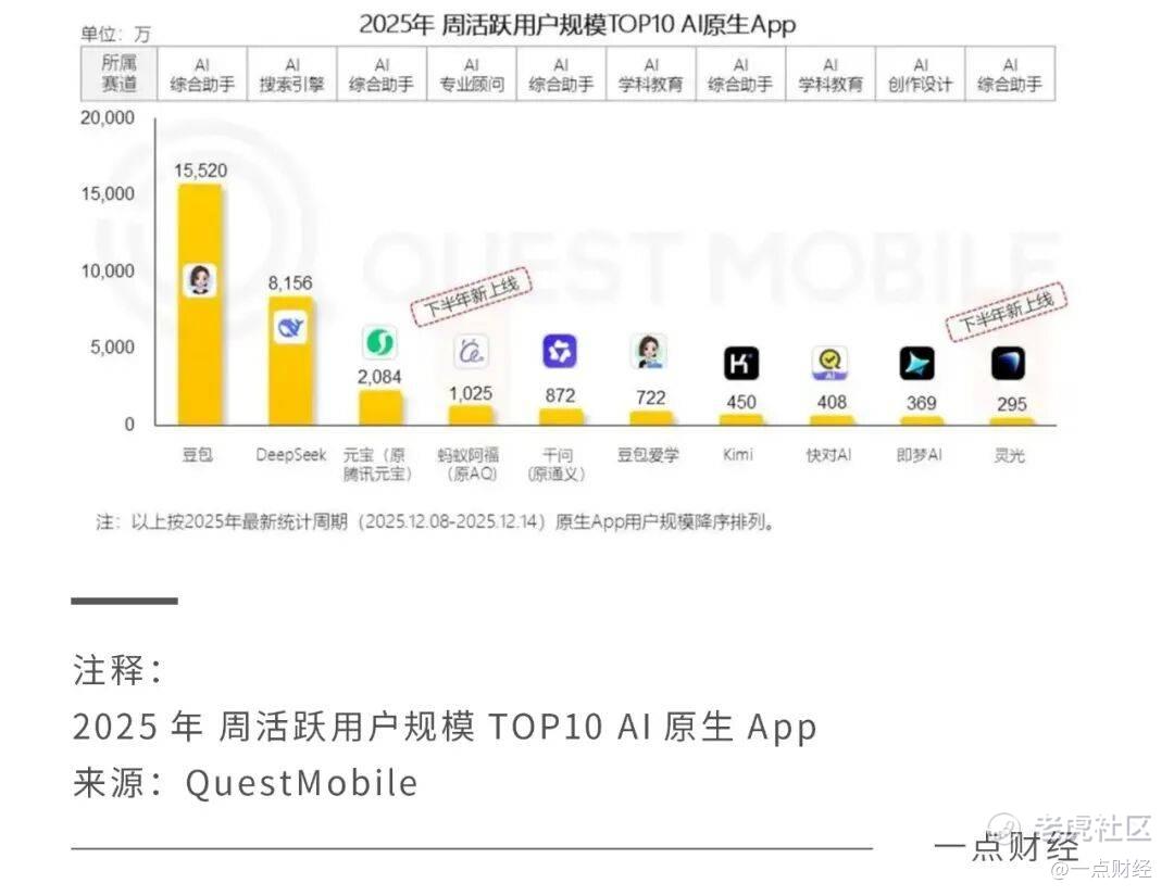 根据研究机构QuestMobile的报告,在2025年12月8日至14日的统计周期内,豆包的周活跃用户规模达到1.55亿,位列市场首位。DeepSeek以8156万的周活跃用户排名第二,元宝以2084万位居第三。