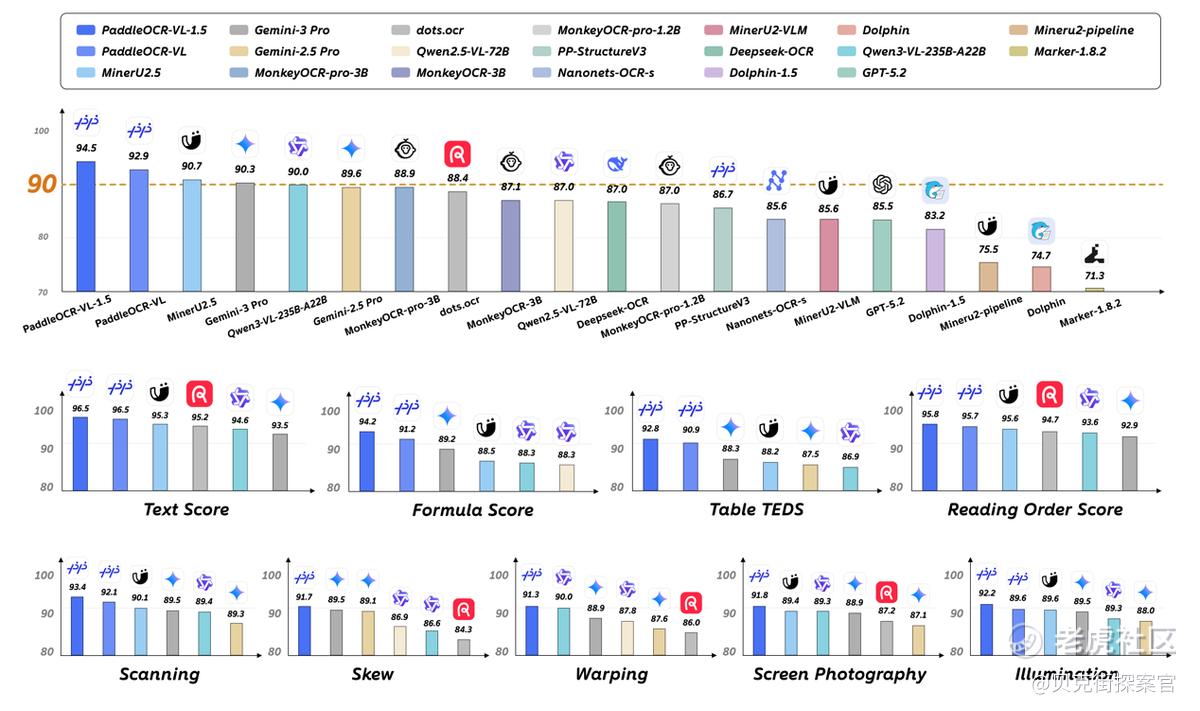 1月29日,百度正式发布并开源新一代文档解析模型PaddleOCR-VL-1.5。该模型以仅0.9B参数的轻量架构,在全球权威文档解析评测榜单OmniDocBench V1.5中取得全球综合性能第一成绩,整体精度达到94.5%,超过Gemini-3-Pro、DeepSeek-OCR2、Qwen3-VL-235B-A22B、GPT-5.2等模型。