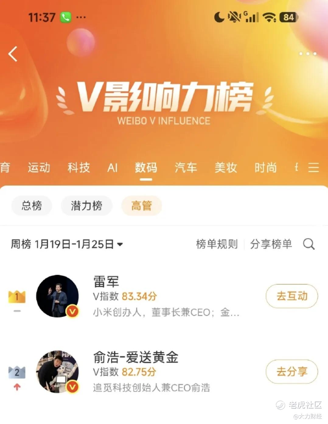 最近,最新微博V影响力数码榜新鲜出炉,雷军稳坐第一,这不稀奇。