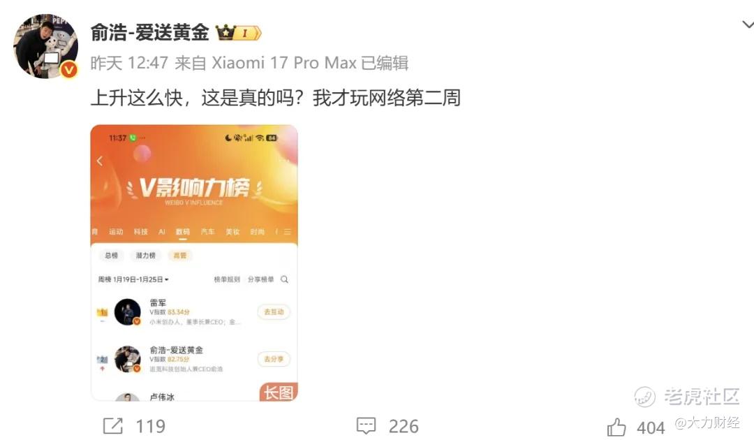 从1月17日开始,他的账号就像“解放天性”,活跃得像个高仿号——最多一天发了13条微博,比同期雷军发的7条还多近一倍。