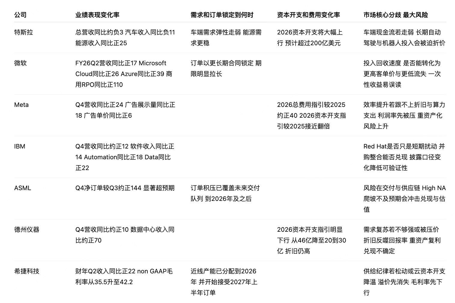 第三个共性是资本开支进入“抢窗口期 / 收割期”的分化,而且这正是几家公司之间的主要分歧点。Meta明确给出激进的费用与资本开支指引,是在用广告现金流抢算力与模型能力的窗口期;特斯拉则在车业务降速后,用能源与现金流底盘支撑更长期的自动驾驶/机器人投入;微软同样处在AI基础设施高投入阶段,但利润表还叠加了一次性投资收益,需要拆开看经营质量。相对地,德州仪器的资本开支开始下调,更多像是多年扩产进入尾声后转向“效率与回报”;阿斯麦也通过组织精简与回购释放“效率优先”的信号。对应到利润分配,超额利润正在向“瓶颈更强、绑定更深”的环节集中:阿斯麦靠不可替代的EUV、希捷靠供货确定性与产品结构、微软/IBM靠平台与软件复利;而像特斯拉的汽车业务更容易受到竞争与价格战影响,因此它的战略重点反而是稳住现金流、为更长期的AI期权续命。