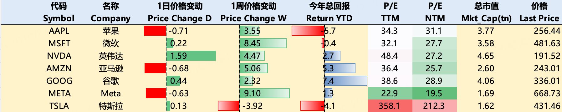 本周市场自上周的避险情绪释放,大科技股普遍上涨。截至1月28日收盘,过去一周 $苹果(AAPL)$ 3.55%, $微软(MSFT)$ 8.45%, $英伟达(NVDA)$ 4.47%, $亚马逊(AMZN)$ 5.06%, $谷歌(GOOG)$ 2.32%, $Meta Platforms, Inc.(META)$ 9.1%, $特斯拉(TSLA)$ -3.92%.