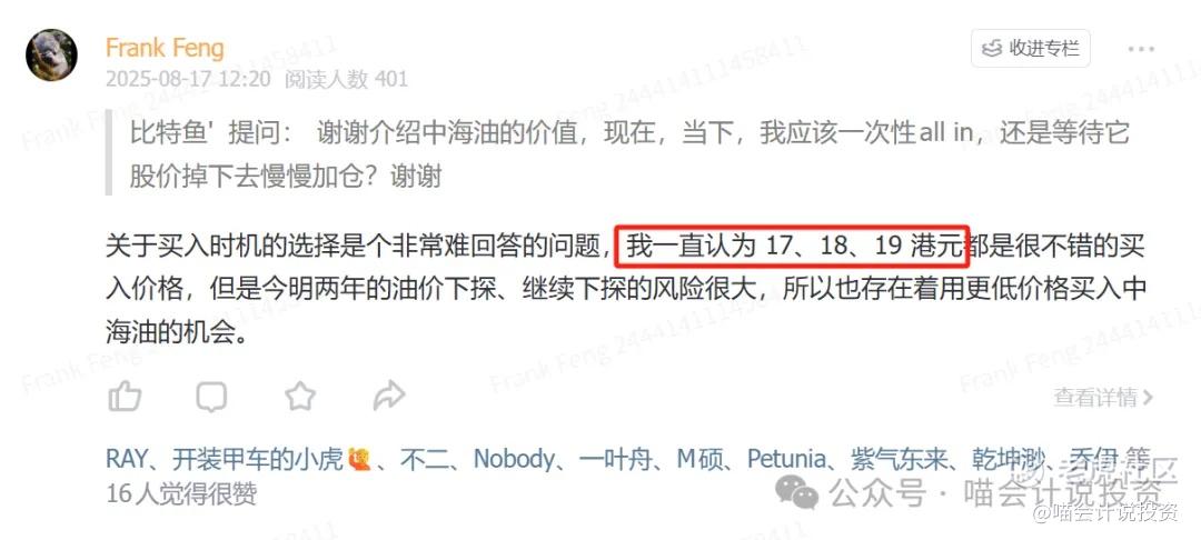 那个时候的股价在18-19港元的位置,各项数据都很好,你偏要蹲更低的价格,那只能随你。你如果先跑去炒了有色、AI,赚了好几倍,再回来买25港币的中海油,那当然更优了。