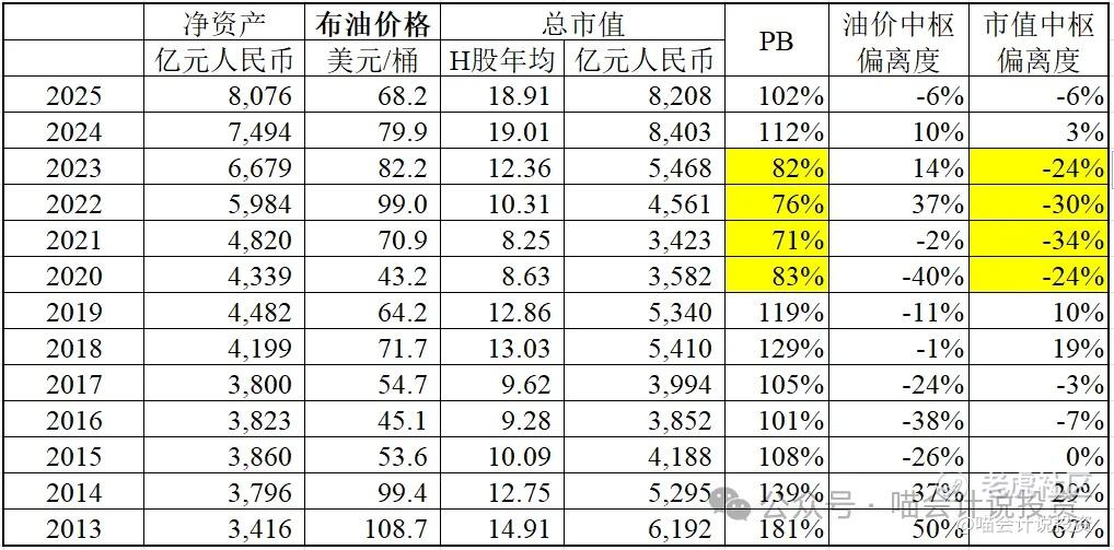 所以PB是衡量中海油股价是便宜是贵的主要依据,而同样的“B”卖的贵不贵,同时要看当年油价和油价中枢偏离程度,简单说就是油价越贵,B可以卖的贵一些。
