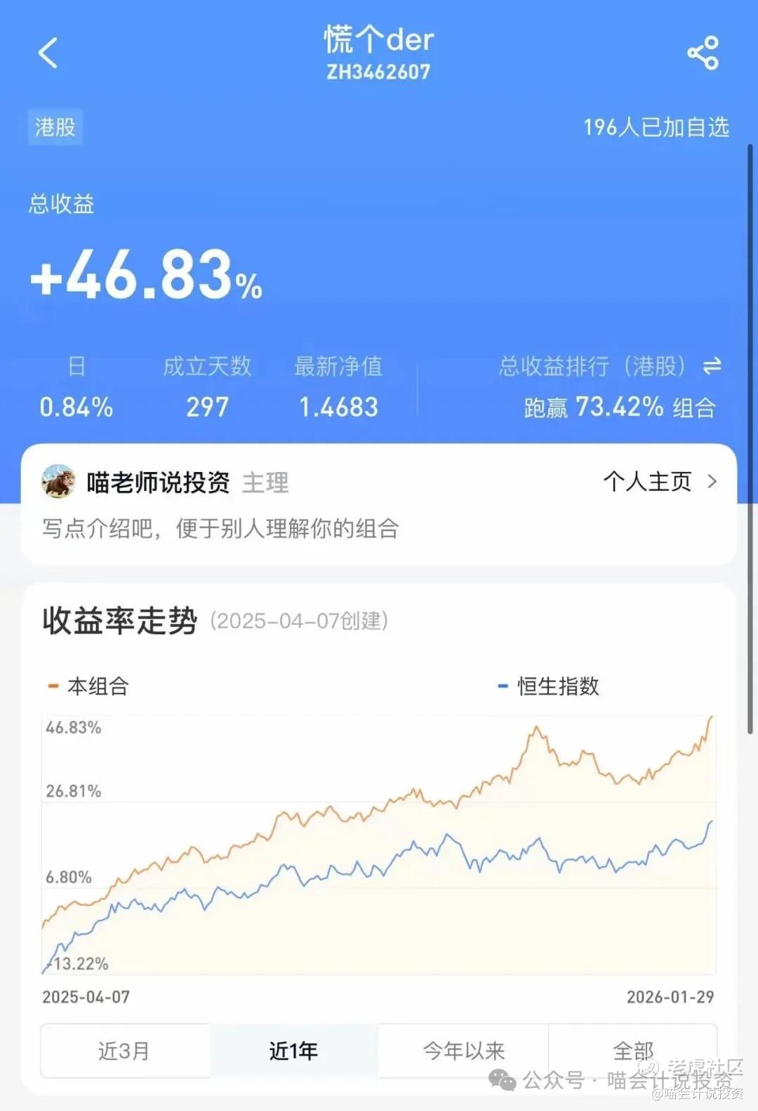 去年4月7日关税战的时候,喵老师在雪球上做了一个组合(一共就两个组合,而且永不调仓,就是用来观察该次投资决策的长期收益率如何),其中配置了30%的中海油,一共也就297天时间。