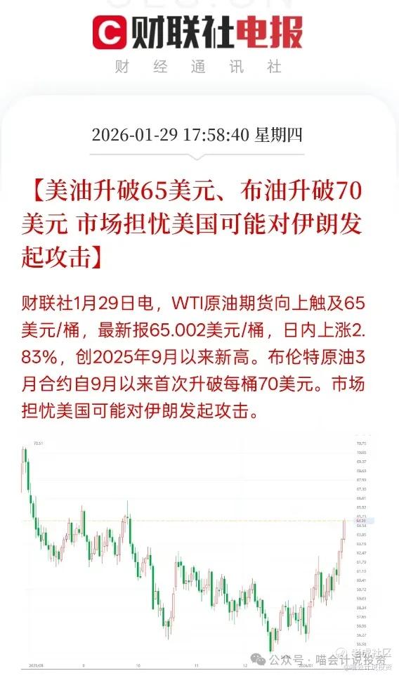 财联社1月29日电,WTI原油期货向上触及65美元/桶,最新报65.002美元/桶,日内上涨2.83%,创2025年9月以来新高。布伦特原油3月合约自9月以来首次升破每桶70美元。市场担忧美国可能对伊朗发起攻击。