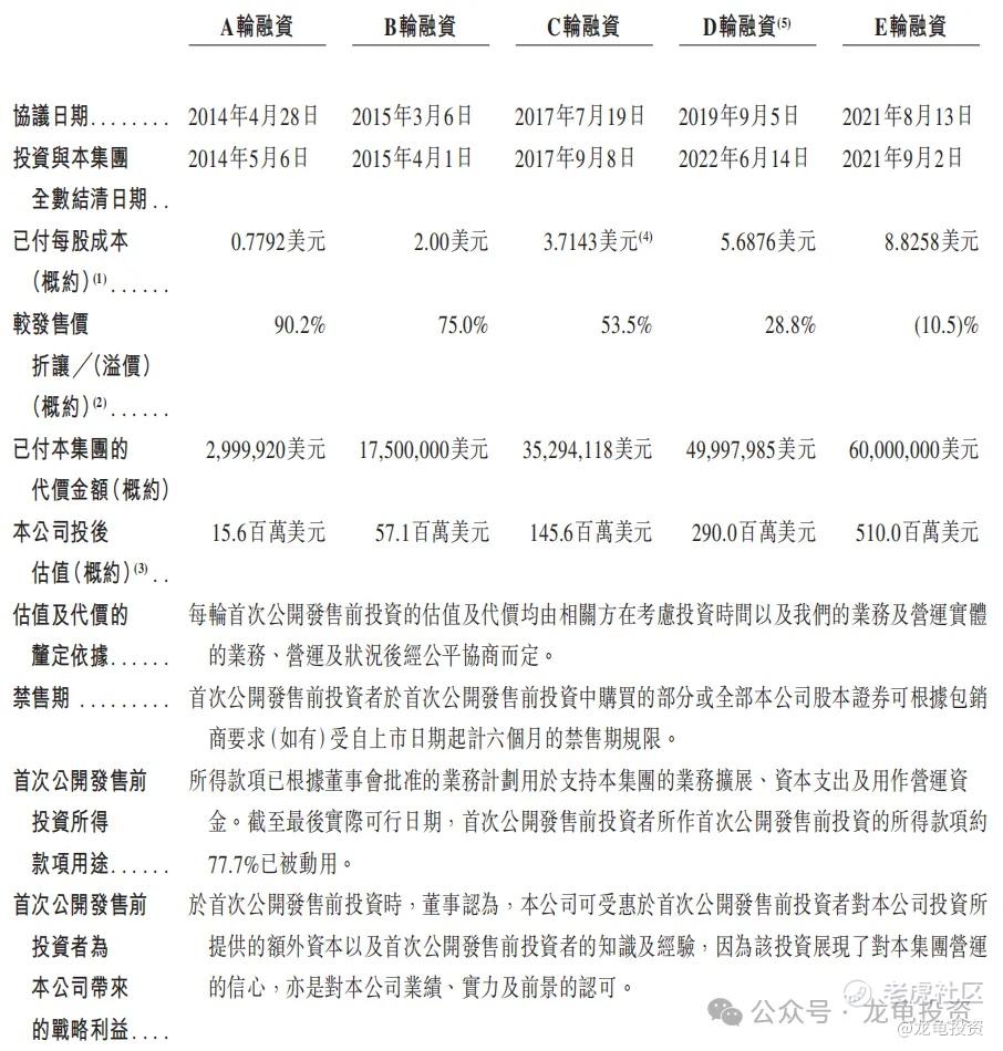IPO前公司总共完成5轮融资,E轮融资完成后,公司估值5.1亿美元,约合39.81亿港元;每股成本8.8258美元,约合68.89港元,较发售价溢价10.5%;禁售期6个月。值得一提的是IPO前E轮融资是腾讯投的6000万美金。