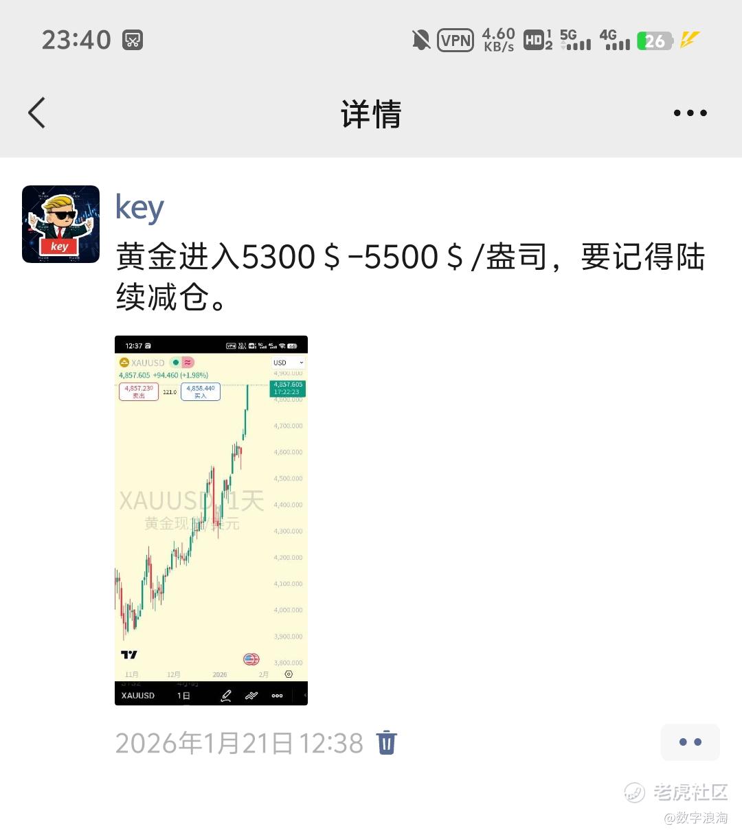 黄金$黄金/美元(XAUUSD.FOREX)$ 完美按照1月21日判断,“进入5300$-5500$要记得陆续减仓”,黄金 最高冲刺至5600$/盎司然后进入回调,接下来观察回调后的价格,再做判断进场机会...