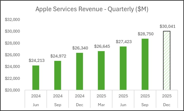 扎克斯一致预期苹果服务业务营收为 300 亿美元,同比增长 14%。下图为苹果服务业务季度营收走势,其中也纳入了本次一致预期数据。