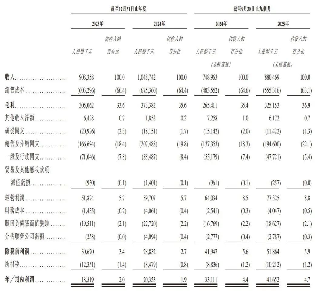 毛利率的稳步提升是本次财报最亮眼的指标之一。期内,公司毛利率从 2023 年的 33.6%,提升至 2024 年的 35.6%,并进一步在 2025 年前九个月达到 36.9%。说明品牌的市场领先地位在持续巩固,市场能接受持续提升的品牌溢价,此外,规模效应与供应链议价能力增强。随着采购规模的扩大,公司对上游制造商的议价能力提升,销售成本占收入比例从 66.4% 降至 63.1%。