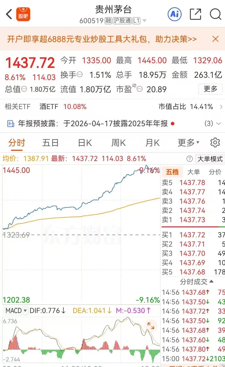 财联社据上证报消息,今日,有市场传言称“贵州茅台证实参与SpaceX上市A轮融资”。贵州茅台方面回应称,此为“不实信息”。贵州茅台1月29日收盘报1437.72元/股,涨8.61%,总市值突破1.8万亿元。