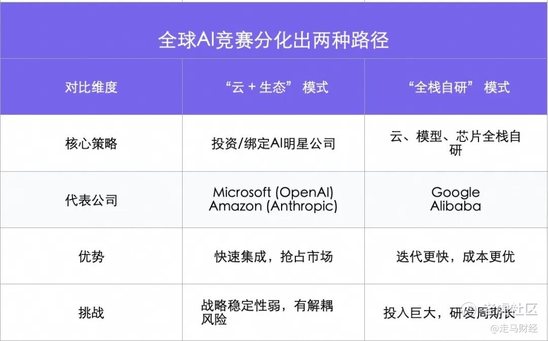 大模型领域,谷歌与阿里都采取全栈自研策略,而微软和亚马逊则采取生态绑定模式,微软选择与OpenAI资源绑定,亚马逊则绑定Anthropic。