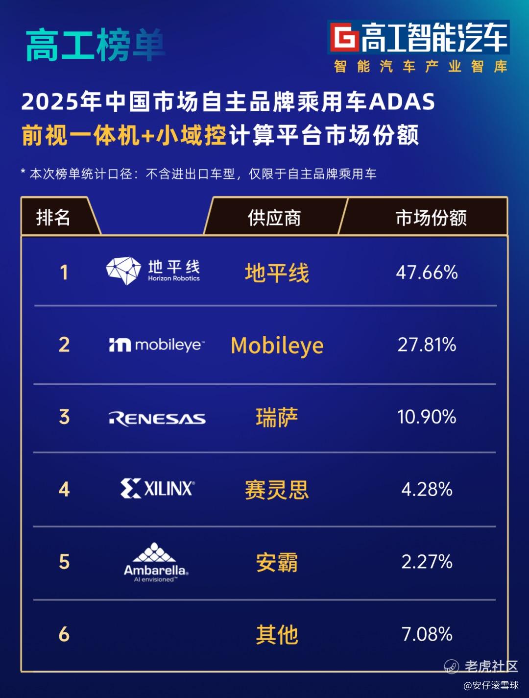 从市场竞争格局来看,在ADAS前视一体机及小域控芯片领域,市场格局高度集中。高工智能汽车研究院监测数据显示,2025年,中国市场自主品牌乘用车ADAS前视一体机+小域控芯片中,地平线和Mobileye市场份额合计达到75%。其中,地平线更以47.66%的份额独占近半壁江山,连续两年蝉联第一。