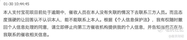 一名用户投诉称,“本人支付宝花呗目前处于逾期中,催收人员在本人没有失联的情况下去联系三方人员。而且态度强硬的让回答认不认识本人,能不能联系上本人。”