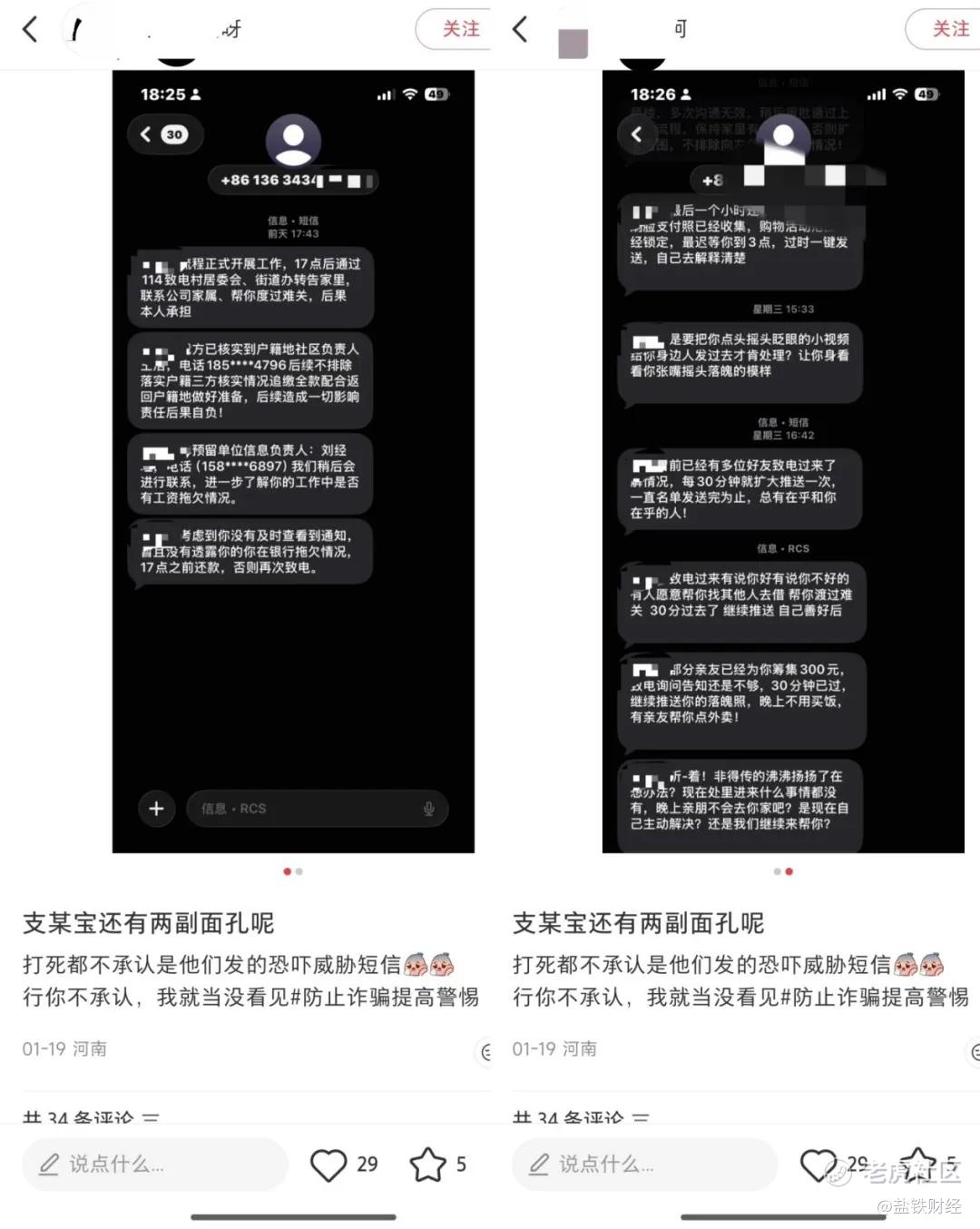 在小红书上,一名用户晒出了支付宝的催收威胁短信,内容包含“17点后通过114致电村居委会、街道办转告家人”“已经有多为好友致电过来了解情况,每30分钟就扩大推送一次,一直(到)名单发送完为止,总有在乎(你)和你在乎的人!”,但和何先生起初联系的回复一样,对方并不承认。