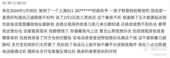 另一名用户则表示被言语威胁。其投诉反映,“我在2026年1月30日接到了一个上海021 207*****的座机号,一男子称是蚂蚁智信的,我态度一直很好,知道自己逾期是不好的,说了2月2日发工资会还,这个催收不听,我逾期了五天就要起诉我,包括电话里面爆我地址威胁我,连我出租房的信息几栋几单元都知道,还扬言我想不到办法,要帮我去想办法,态度极其恶劣。然后挂了电话马上就开始发短信轰炸。”