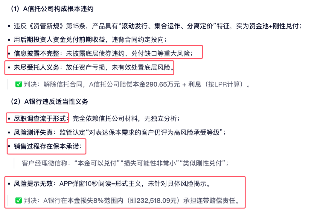 2 、在北京市东城区人民法院(2024)京0101民初18627号民事判决书中,根据一审判决查明的事实,A银行作为专业金融机构,对代销产品的相关风险评估和管理不够审慎,对涉及代销产品发行主体的负面消息未及时采取应对措施,在代销产品底层已经出现违约事件后仅援引A信托公司给予的信息,未经自主分析;未及时采取应对措施而仍向金融消费者进行销售,其行为也构成对适当义务的违反。沈×1举证的监管回复意见中还认定了A银行对投资者风险承受能力评估存在缺陷,该缺陷亦是A银行承担适当性义务的重要内容。