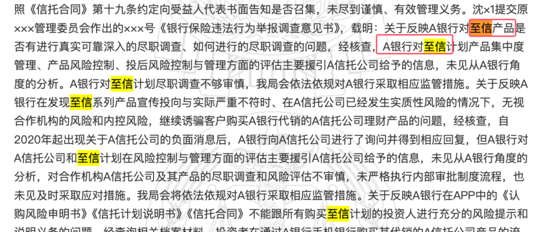 6 、判决书显示,沈×1曾经向监管部门反应情况,监管部门给了确定性回复,“沈×1提交原×××管理委员会作出的×××号《银行保险违法行为举报调查意见书》,载明:关于反映A银行对至信产品是否有进行真实可靠深入的尽职调查、如何进行的尽职调查的问题,经核查,A银行对至信计划产品集中度管理、产品风险控制、投后风险控制与管理方面的评估主要援引A信托公司给予的信息,未见从A银行角度的分析。A银行对至信计划尽职调查不够审慎,我局会依法依规对A银行采取相应监管措施。”