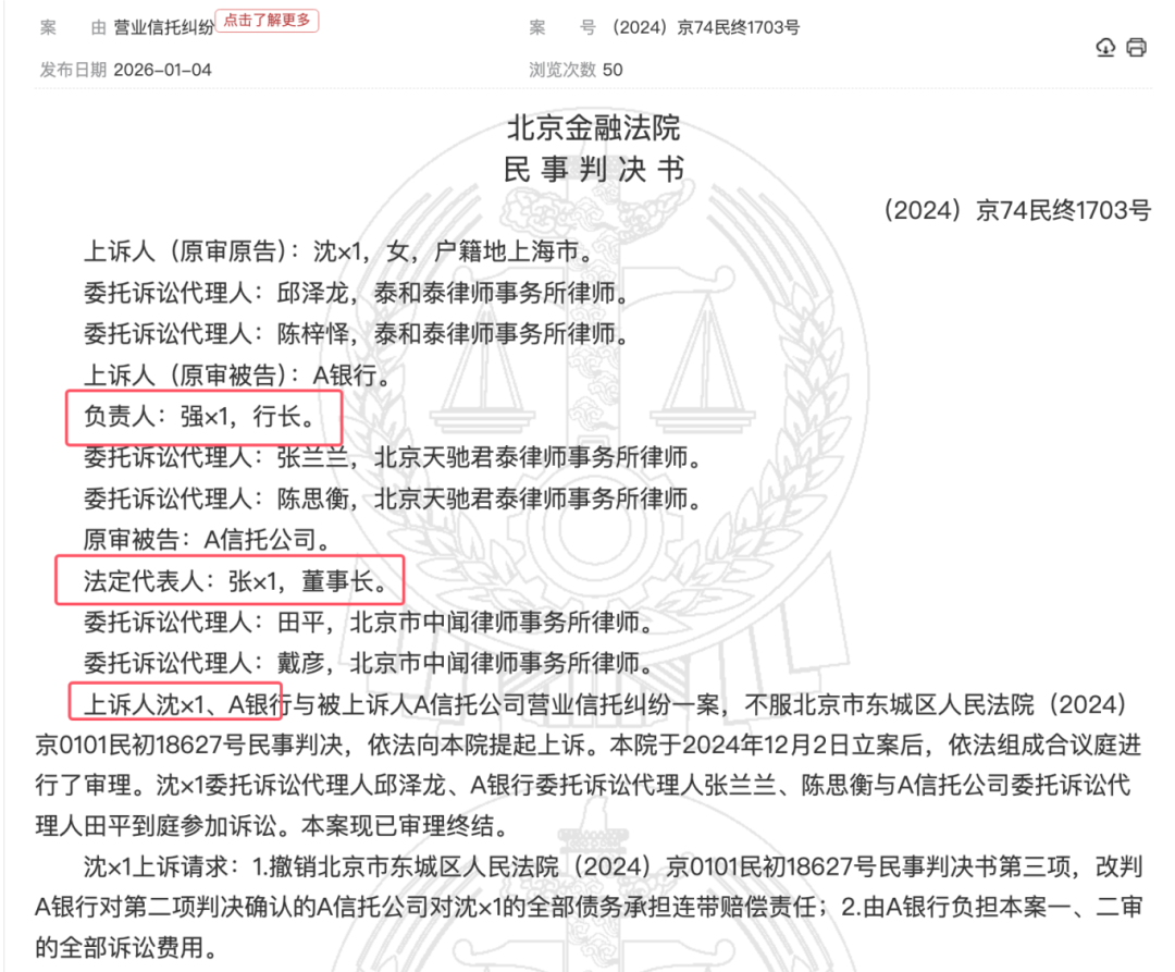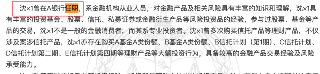4 、裁判文书显示,沈×1曾在A银行任职,系金融机构从业人员,而裁判文书多次使用 被上诉人A银行,以此推论,沈×1疑似是前东亚银行员工。