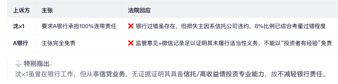 最终结论:A银行的抗辩理由部分具有合理性,但不足以免除其责任。法院认为其过错与投资者损失存在相当因果关系,故维持8%的连带赔偿比例。