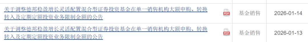 这一内容与此前德邦基金靠互联网“大V”带货的传言吻合。就在今年1月12日,德邦基金旗下德邦稳盈增长灵活配置混合在蚂蚁基金渠道大卖,仅一天便热卖120亿元。这一爆款“神话”当时便引起市场热议,德邦基金后多次否认盘中数据。不过从公告看,该产品随后接连两次收紧申购门槛:先是在1月13日开盘前,把A类份额单渠道单日申购上限设为1000万元,C类设为100万元;次日又将A/C两类份额的限购额分别收紧至10万元和1万元。