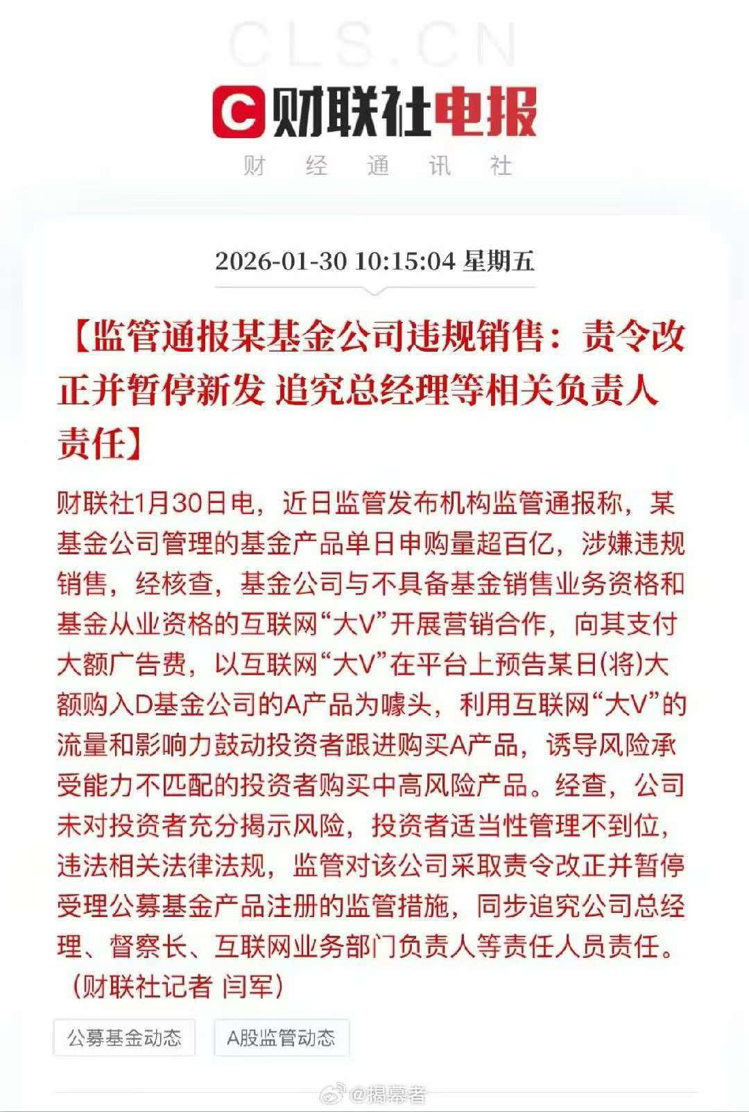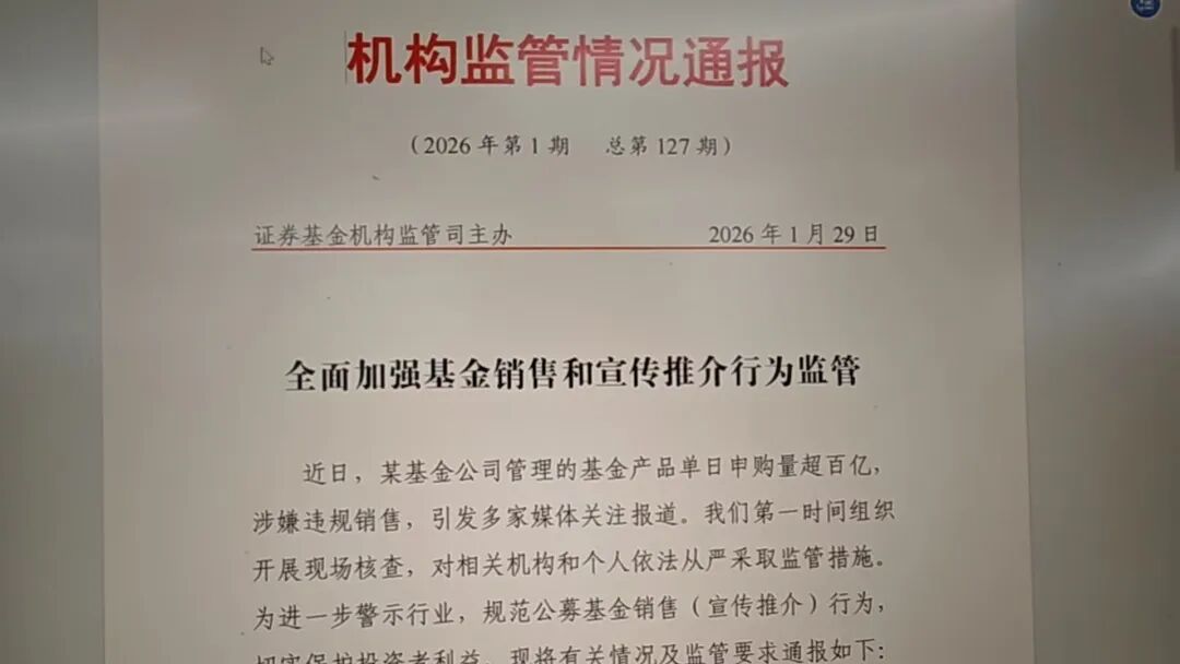 2026年第1期(总第127期)机构监管情况通报中,监管部门表示,“经核查,D基金公司与不具备基金销售业务资格和基金从业资格的互联网‘大V’开展营销合作,向其支付大额广告费,以互联网‘大V’在平台上预告某日(将)大额购入D基金公司的A产品为噱头,利用互联网‘大V’的流量和影响力鼓动投资者跟进购买A产品,诱导风险承受能力不匹配的投资者购买中高风险产品。经查,公司未对投资者充分揭示风险,投资者适当性管理不到位,违反了《公开募集证券投资基金管理人监督管理办法》第二十一条规定”。