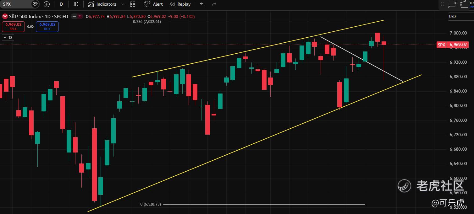 1、从盘前的情况看,今晚还要持续震荡,SPX强支撑6850(下图黄色划线)大底6712(12月17日的低点),这道防线再破的话,这波上涨趋势算坏掉了。
