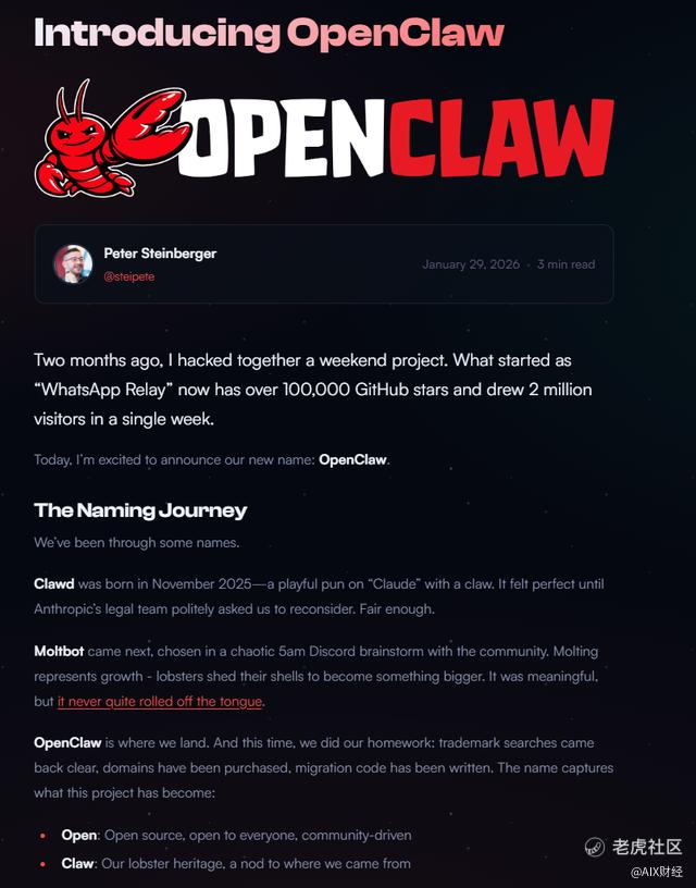 2026年1月27日,因AI巨头Anthropic指控“Clawdbot”与其旗下的“Claude”商标相似,Peter被迫将项目更名为Moltbot。1月29日,Peter又将名字改为OpenClaw,Open意为开源、对所有人开放、社区驱动;Claw则代表了要不忘项目的初心和来路。