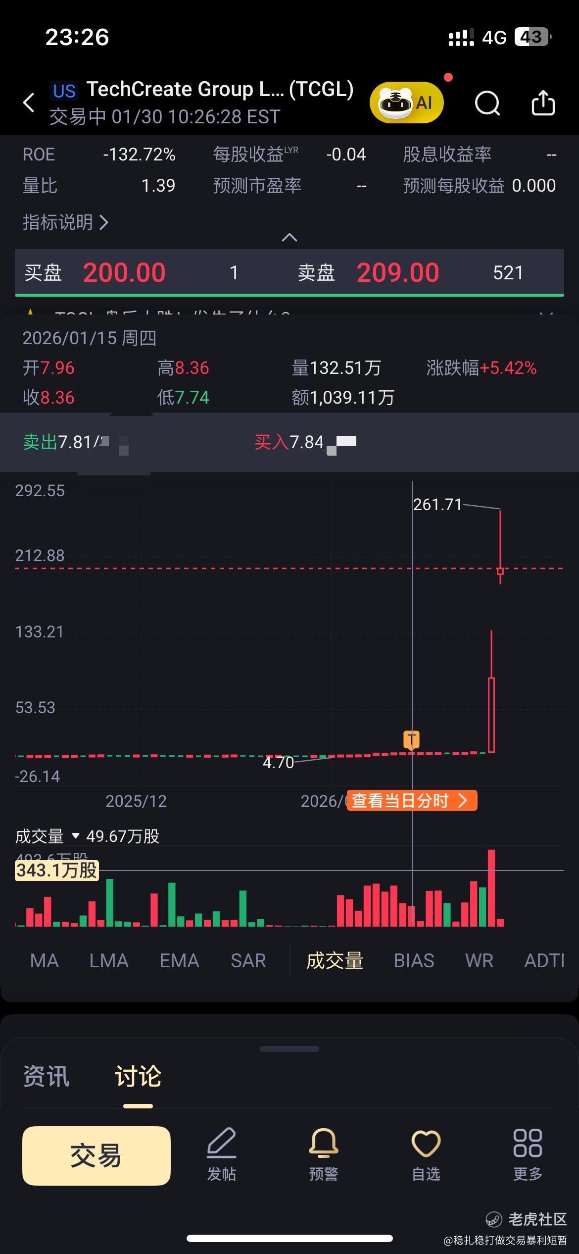 {"i18n":{"language":"zh_CN"},"detailType":1,"isChannel":false,"data":{"magic":2,"id":527425403839712,"tweetId":"527425403839712","gmtCreate":1769786931642,"gmtModify":1769786934870,"author":{"id":4096466110857550,"idStr":"4096466110857550","authorId":4096466110857550,"authorIdStr":"4096466110857550","name":"稳扎稳打做交易暴利短暂","avatar":"https://static.tigerbbs.com/3180f85b3f9559e18b13c28b228adaf8","vip":1,"userType":1,"introduction":"","boolIsFan":false,"boolIsHead":false,"crmLevel":3,"crmLevelSwitch":1,"currentWearingBadge":{"badgeId":"e50ce593bb40487ebfb542ca54f6a561-1","templateUuid":"e50ce593bb40487ebfb542ca54f6a561","name":"出道虎友","description":"加入老虎社区500天","bigImgUrl":"https://static.tigerbbs.com/0e4d0ca1da0456dc7894c946d44bf9ab","smallImgUrl":"https://static.tigerbbs.com/0f2f65e8ce4cfaae8db2bea9b127f58b","grayImgUrl":"https://static.tigerbbs.com/c5948a31b6edf154422335b265235809","redirectLinkEnabled":0,"hasAllocated":1,"isWearing":1,"stampPosition":0,"hasStamp":0,"allocationCount":1,"allocatedDate":"2024.03.29","individualDisplayEnabled":0},"individualDisplayBadges":[],"fanSize":32,"starInvestorFlag":false},"themes":[],"images":[{"img":"https://static.tigerbbs.com/b1548817c642242c612b3dbab576ac5a","width":"1170","height":"2532"}],"coverImages":[{"img":"https://static.tigerbbs.com/b1548817c642242c612b3dbab576ac5a","width":"1170","height":"2532"}],"title":"","html":"<html><head></head><body><p><a href=\"https://laohu8.com/S/TCGL\">$TechCreate Group Ltd.(TCGL)$</a> 没拿住 哎!不然30-40倍的回报率!气死了!</p><img src=\"https://static.tigerbbs.com/b1548817c642242c612b3dbab576ac5a\" tg-width=\"1170\" tg-height=\"2532\"></body></html>","htmlText":"<html><head></head><body><p><a href=\"https://laohu8.com/S/TCGL\">$TechCreate Group Ltd.(TCGL)$</a> 没拿住 哎!不然30-40倍的回报率!气死了!</p><img src=\"https://static.tigerbbs.com/b1548817c642242c612b3dbab576ac5a\" tg-width=\"1170\" tg-height=\"2532\"></body></html>","text":"$TechCreate Group Ltd.(TCGL)$ 没拿住 哎!不然30-40倍的回报率!气死了!","highlighted":1,"essential":1,"paper":1,"likeSize":2,"commentSize":2,"repostSize":0,"favoriteSize":0,"link":"https://laohu8.com/post/527425403839712","repostId":0,"isVote":1,"tweetType":1,"viewCount":198,"commentLimit":10,"likeStatus":false,"favoriteStatus":false,"reportStatus":false,"symbols":["TCGL"],"verified":2,"subType":0,"readableState":1,"langContent":"CN","currentLanguage":"CN","warmUpFlag":false,"orderFlag":false,"shareable":true,"causeOfNotShareable":"","featuresForAnalytics":[],"commentAndTweetFlag":false,"andRepostAutoSelectedFlag":false,"upFlag":false,"length":63,"optionInvolvedFlag":false,"xxTargetLangEnum":"ZH_CN"},"commentList":[{"id":527432438308944,"commentId":"527432438308944","gmtCreate":1769788652071,"gmtModify":1769788658153,"authorId":3567749400938530,"author":{"id":3567749400938530,"idStr":"3567749400938530","authorId":3567749400938530,"name":"绿地云上府_吴乾德187","avatar":"https://static.tigerbbs.com/4cd4ec11aec2d86aa815aaccacdb4012","vip":1,"hat":"https://static.tigerbbs.com/f84d87792f02cf78e80ee34979fd31e5","crmLevel":2,"crmLevelSwitch":1,"individualDisplayBadges":[]},"repliedAuthorId":0,"objectId":527425403839712,"objectIdStr":"527425403839712","type":1,"supId":0,"supIdStr":"0","prevId":0,"prevIdStr":"0","content":"盘后最高463","text":"盘后最高463","html":"盘后最高463","likeSize":0,"commentSize":1,"subComments":[{"id":527437758215648,"commentId":"527437758215648","gmtCreate":1769789927787,"gmtModify":1769789933616,"authorId":4096466110857550,"author":{"id":4096466110857550,"idStr":"4096466110857550","authorId":4096466110857550,"name":"稳扎稳打做交易暴利短暂","avatar":"https://static.tigerbbs.com/3180f85b3f9559e18b13c28b228adaf8","vip":1,"currentWearingBadge":{"badgeId":"e50ce593bb40487ebfb542ca54f6a561-1","templateUuid":"e50ce593bb40487ebfb542ca54f6a561","name":"出道虎友","description":"加入老虎社区500天","bigImgUrl":"https://static.tigerbbs.com/0e4d0ca1da0456dc7894c946d44bf9ab","smallImgUrl":"https://static.tigerbbs.com/0f2f65e8ce4cfaae8db2bea9b127f58b","grayImgUrl":"https://static.tigerbbs.com/c5948a31b6edf154422335b265235809","redirectLinkEnabled":0,"hasAllocated":1,"isWearing":1,"stampPosition":0,"hasStamp":0,"allocationCount":1,"allocatedDate":"2024.03.29","individualDisplayEnabled":0,"individualDisplaySort":0,"categoryType":1001},"crmLevel":3,"crmLevelSwitch":1,"individualDisplayBadges":[]},"repliedAuthorId":0,"objectId":527425403839712,"objectIdStr":"527425403839712","type":1,"supId":527432438308944,"supIdStr":"527432438308944","prevId":0,"prevIdStr":"0","content":"那也是早上估计没看 就拿现在来说妥妥大肉🥩","text":"那也是早上估计没看 就拿现在来说妥妥大肉🥩","html":"那也是早上估计没看 就拿现在来说妥妥大肉🥩","disclaimerType":0}],"verified":10,"allocateAmount":0,"commentType":"valid","coins":0,"score":0,"disclaimerType":0}],"isCommentEnd":false,"isTiger":false,"isWeiXinMini":false,"url":"/m/post/527425403839712"}